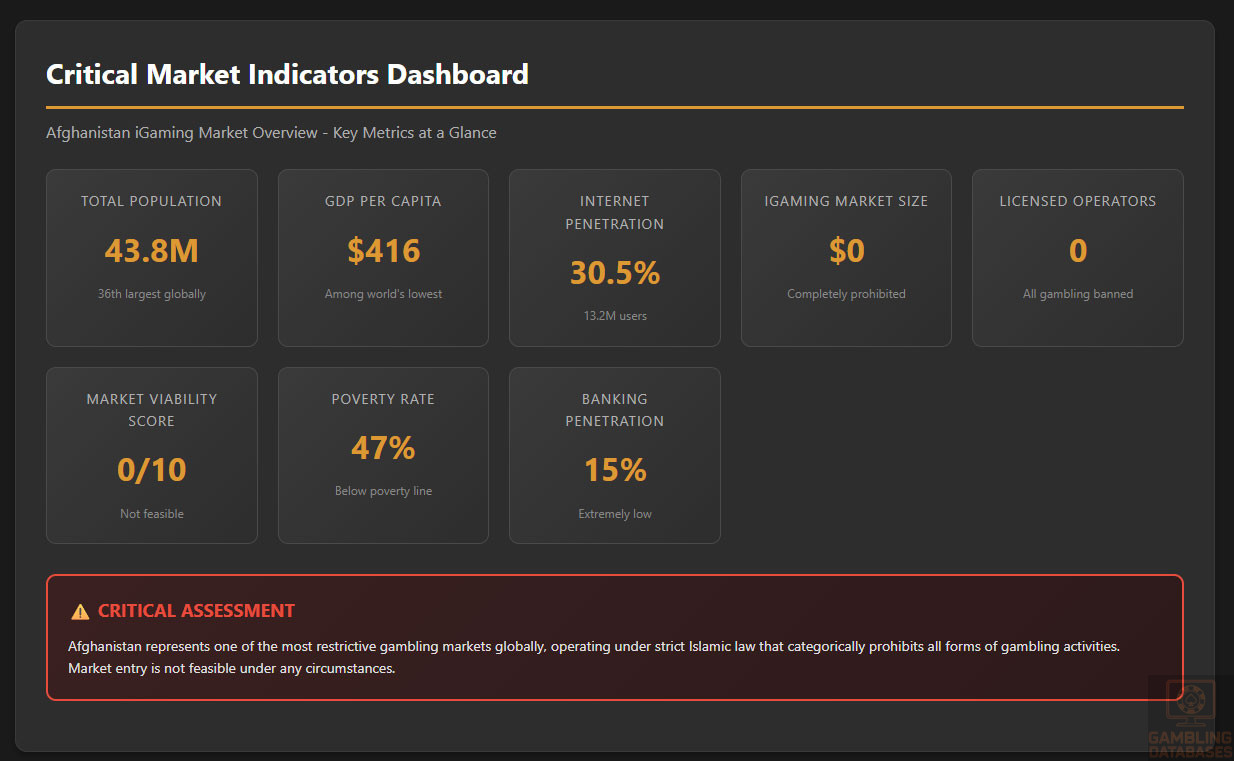 HONEST ASSESSMENT: Afghanistan represents the absolute worst gambling market globally – not just “difficult” or “restricted” but completely impossible and extremely dangerous. ALL gambling is prohibited under Sharia law with severe penalties including imprisonment, property confiscation, and detention without judicial proceedings by morality police. The Taliban government since August 2021 enforces strict Islamic law with historical precedent of gambling punishments resulting in fatalities during 1996-2001 regime. Beyond legal prohibition, the market offers nothing: GDP per capita $416, 47% poverty rate, 3.58 Mbps broadband, periodic nationwide telecommunications shutdowns, banking disconnected from SWIFT, 99%+ Muslim population with universal religious opposition to gambling. This is not a market – it is a life-threatening trap. Any consideration of market entry demonstrates catastrophically poor judgment.