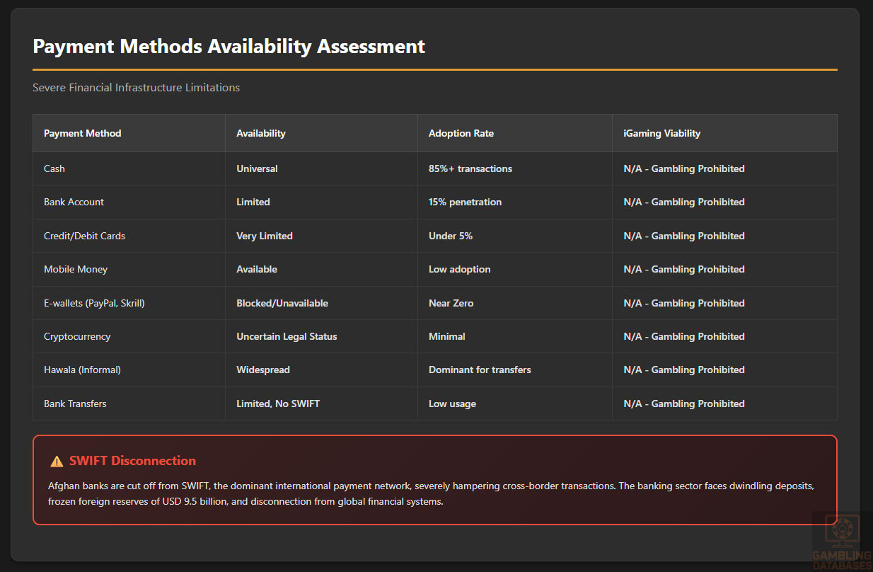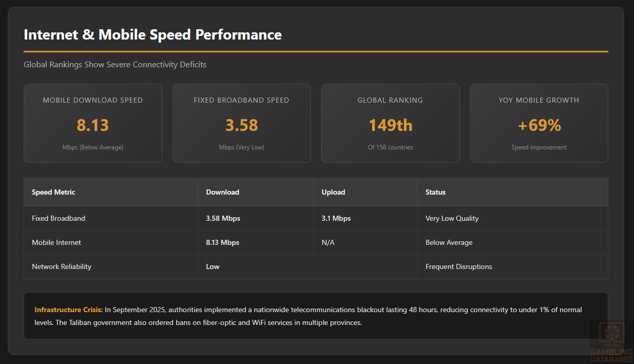 | Practical Accessibility | 30% | 0.0/3.0 | Severe restrictions with extensive barriers (0 points base). Payment methods: Cash dominates 85%+ of transactions, banking penetration only 15%, credit/debit cards under 5% penetration (-0.5), international e-wallets unavailable/blocked (-0.5), cryptocurrency unclear legal status (-0.5). ISP monitoring active with government announcing plans to block social media platforms including Facebook. September 2025: nationwide telecommunications shutdown reduced connectivity to under 1% for 48 hours. Internet penetration only 30.5%, median mobile speed 8.13 Mbps. Afghanistan controls .af domain – no gambling domains permitted. Result: 0.0/3.0 |