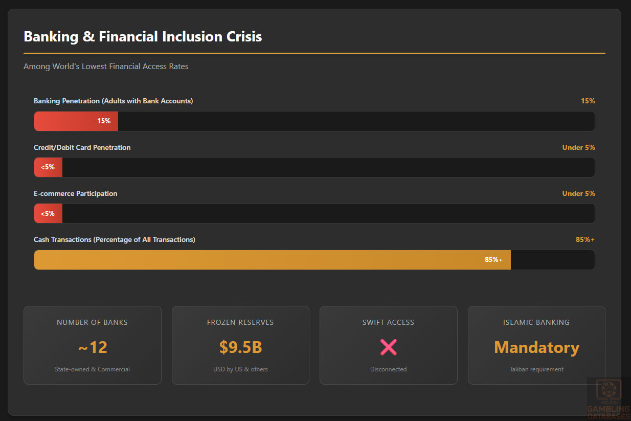- Zero Financial Infrastructure: Banking penetration 15% (world’s lowest), SWIFT disconnected, $9.5B reserves frozen internationally, payment processing impossible, credit cards under 5% penetration, international e-wallets blocked, cryptocurrency status unclear.