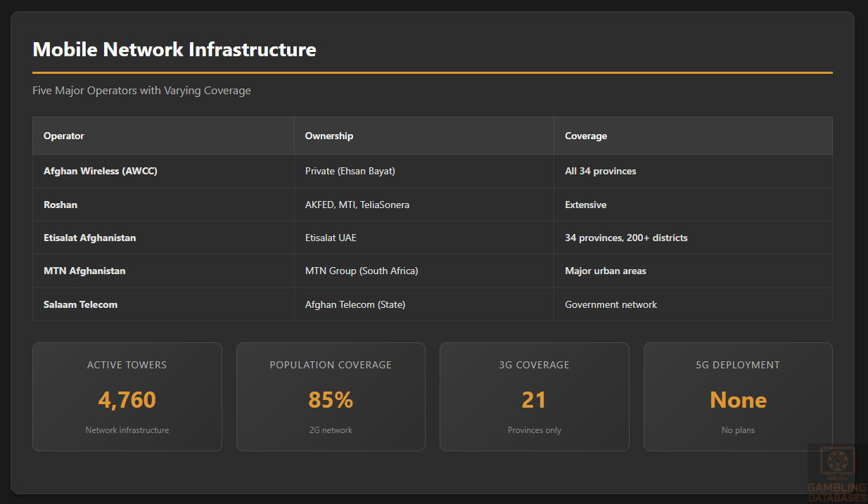 International Operators: No international gambling companies maintain legal operations in Afghanistan. Major global operators explicitly exclude Afghanistan from their service territories due to the complete prohibition and associated risks.