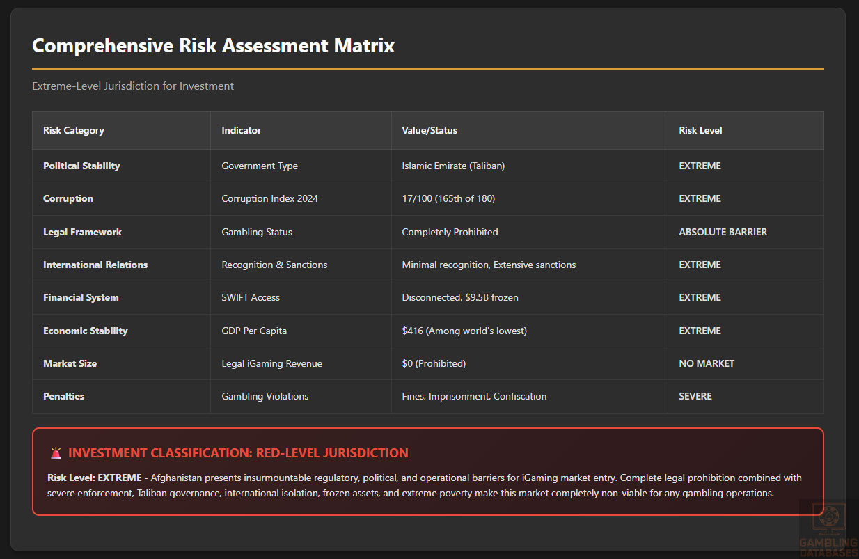 ⚠️ BOTTOM LINE: Afghanistan is not a market – it is a legal, financial, and physical danger zone for gambling operations that must be avoided absolutely and completely by all industry participants without exception.
