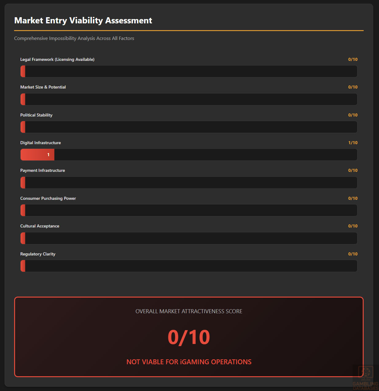 | Market Attractiveness Score | 0/10 | Not viable for iGaming operations |