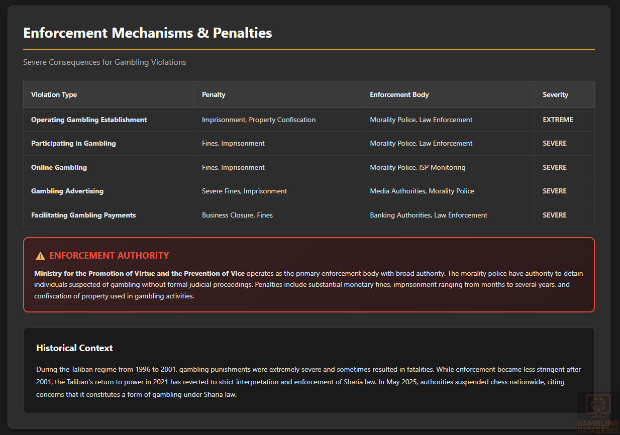Enforcement History: Taliban regime 1996-2001 imposed extreme punishments for gambling violations including fatalities. Current Taliban government since August 2021 has reverted to strict Sharia law interpretation and enforcement through Ministry for Promotion of Virtue and Prevention of Vice with broad powers and minimal oversight.