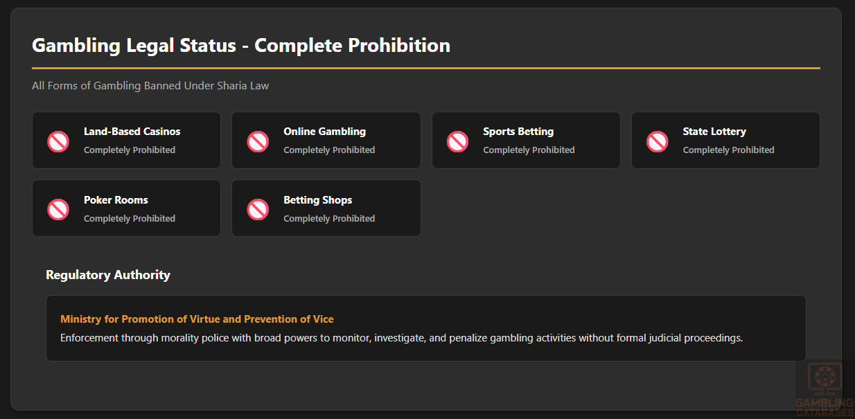 | Gambling Legal Status | Completely Prohibited | All forms banned under Sharia law |