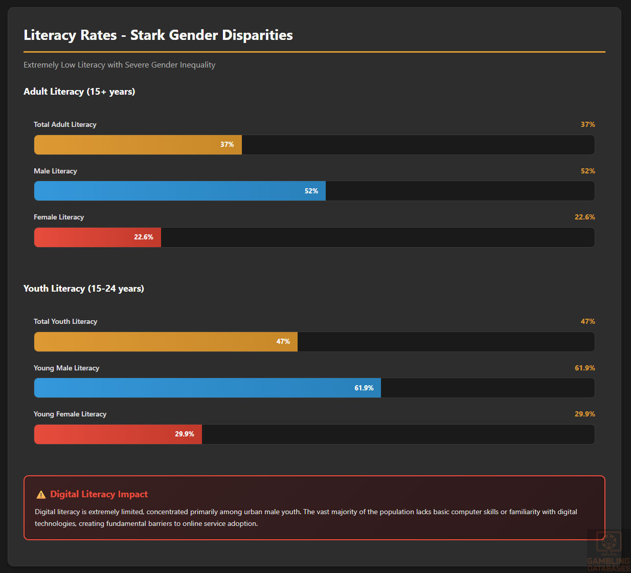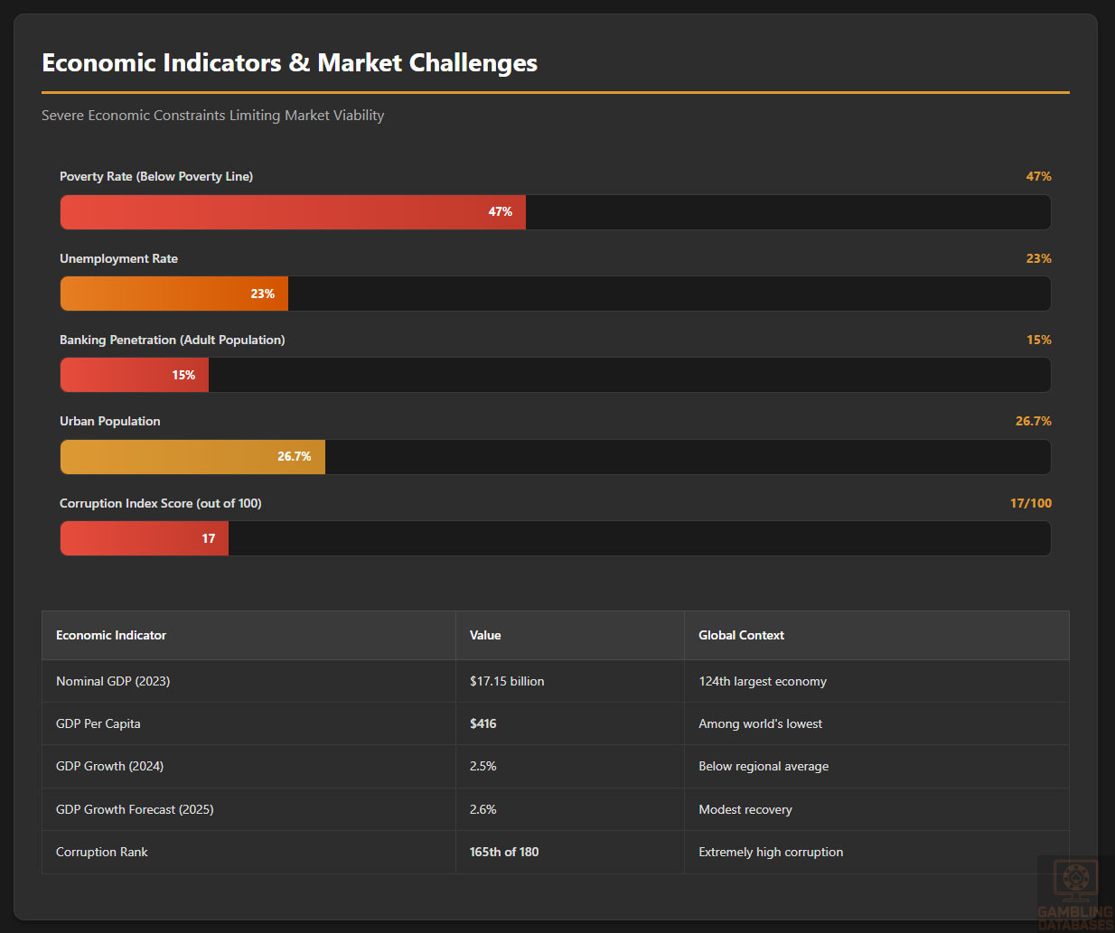 - EXTREME POVERTY: GDP per capita of $416 (among world’s lowest), 47% below poverty line, 23%+ unemployment – population has zero disposable income for gambling.