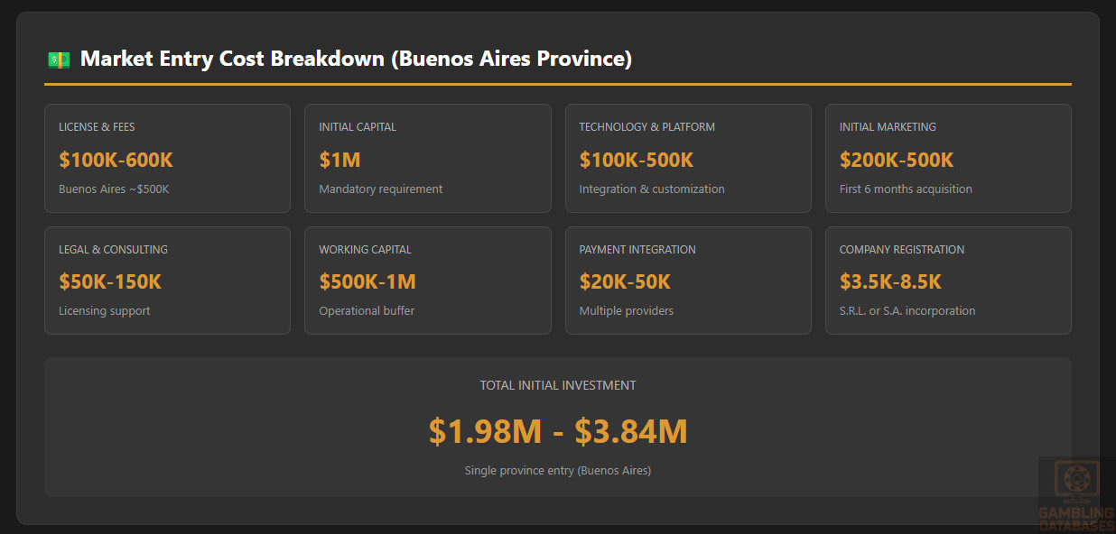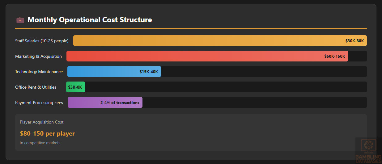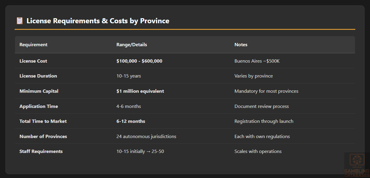 Monthly Operating Costs: USD 150,000-400,000+ per month depending on scale. Includes: staff costs (compliance, customer service, marketing, technology), server hosting and payment processing fees, responsible gambling systems maintenance, regulatory reporting, provincial tax payments, federal tax compliance, marketing spend (heavily restricted), payment method fees (higher in Argentina), and currency hedging costs.