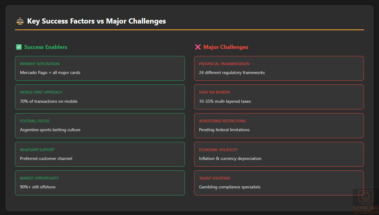 - Payment Processing Complexity: Banks frequently block gambling transactions; cryptocurrency acceptance is limited; chargebacks are common with Argentine payment methods.