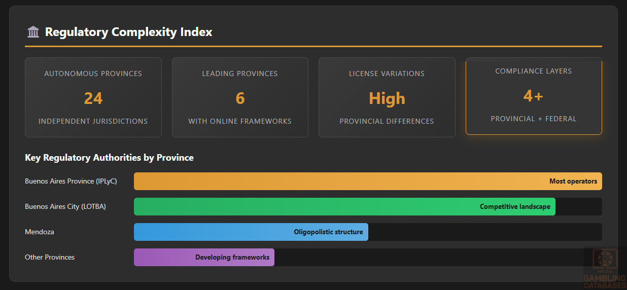 Licensing authority varies by province, with Instituto Provincial de Lotería y Casinos (IPLyC) administering Buenos Aires Province licenses and Lotería de la Ciudad (LOTBA) overseeing Buenos Aires City operations.