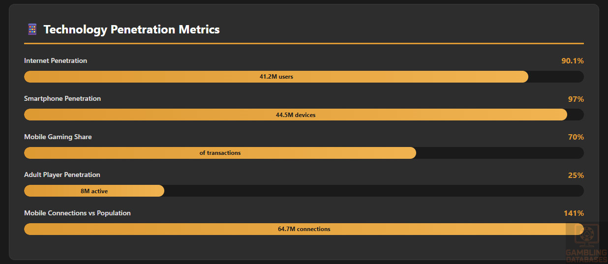 - Exceptional Digital Infrastructure: 90.1 percent internet penetration, 97 percent smartphone adoption, 141 percent mobile connection rate, and 70 percent of gambling transactions via mobile devices.