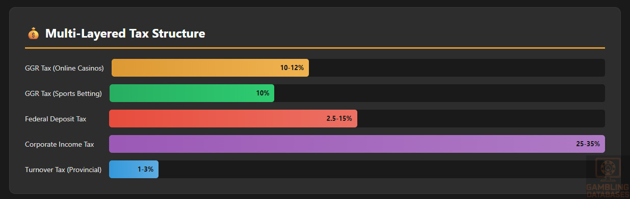 - Multi-Layer Taxation: Combined provincial GGR tax (10-12 percent), federal deposit tax (2.5-15 percent), and corporate income tax (25-35 percent) create effective tax rates of 37-62 percent on revenue.
