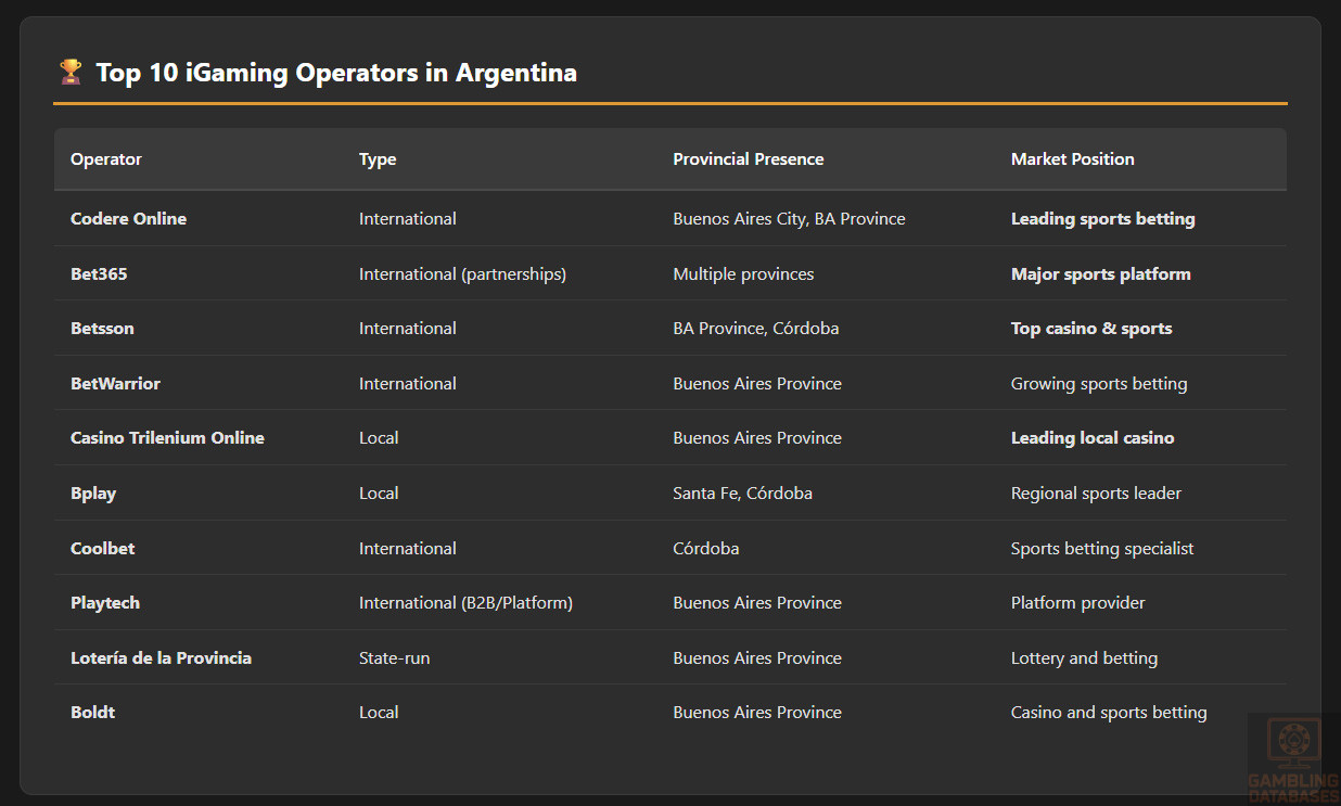 | Betsson | International | Buenos Aires Province, Córdoba | Top casino and sports operator |