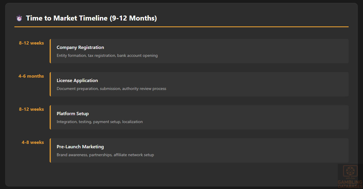 Technical certifications must be obtained from approved testing laboratories, with Random Number Generator (RNG) certification, game fairness verification, and responsible gambling system validation required before launch.