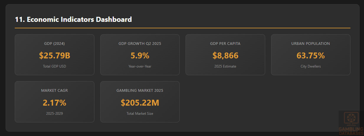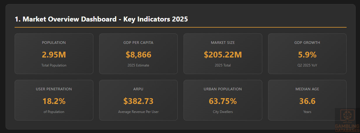 - [Market Size Reality:] Only 537,400 gambling users in population of 2.95 million = 18.2% penetration. Total market $205M with casino/games $127M and sports betting only $11.8M. Average revenue per user $383 annually. Projected growth to only $223.6M by 2029. THIS IS TINY MARKET. With $1.5M license + $1M+ operating costs, need $3-5M+ annual revenue just to break even = 2.5% of total market share required just to survive.