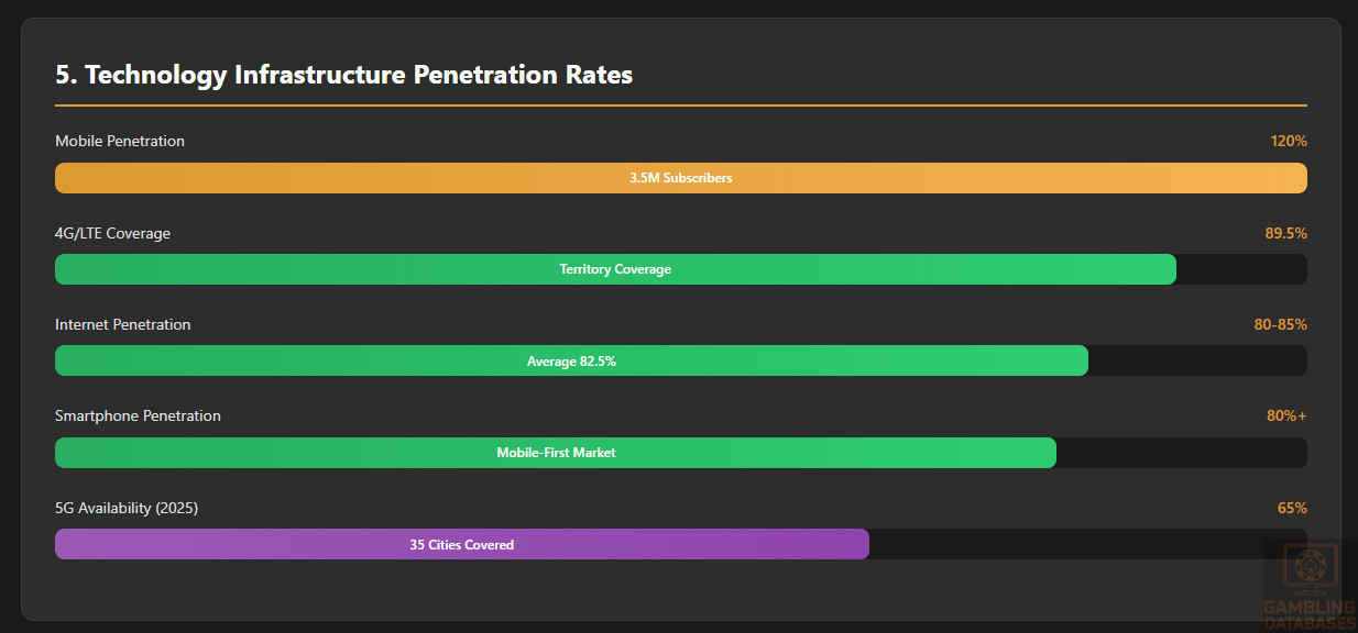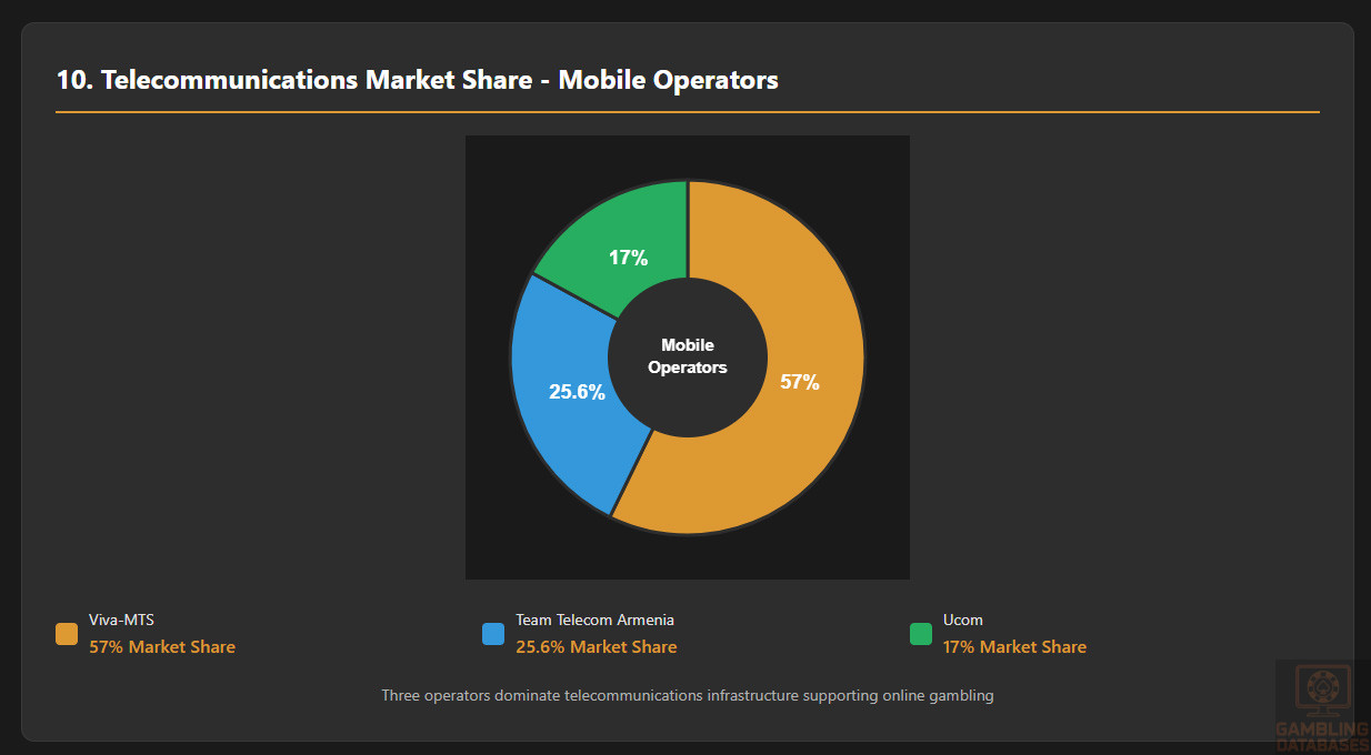Three mobile network operators dominate telecommunications infrastructure supporting online gambling: Viva-MTS commands approximately 57% of mobile subscriptions, Team Telecom Armenia holds 25.6%, and Ucom maintains 17% market share. These providers enable the mobile-first gambling experience prevalent in the market.