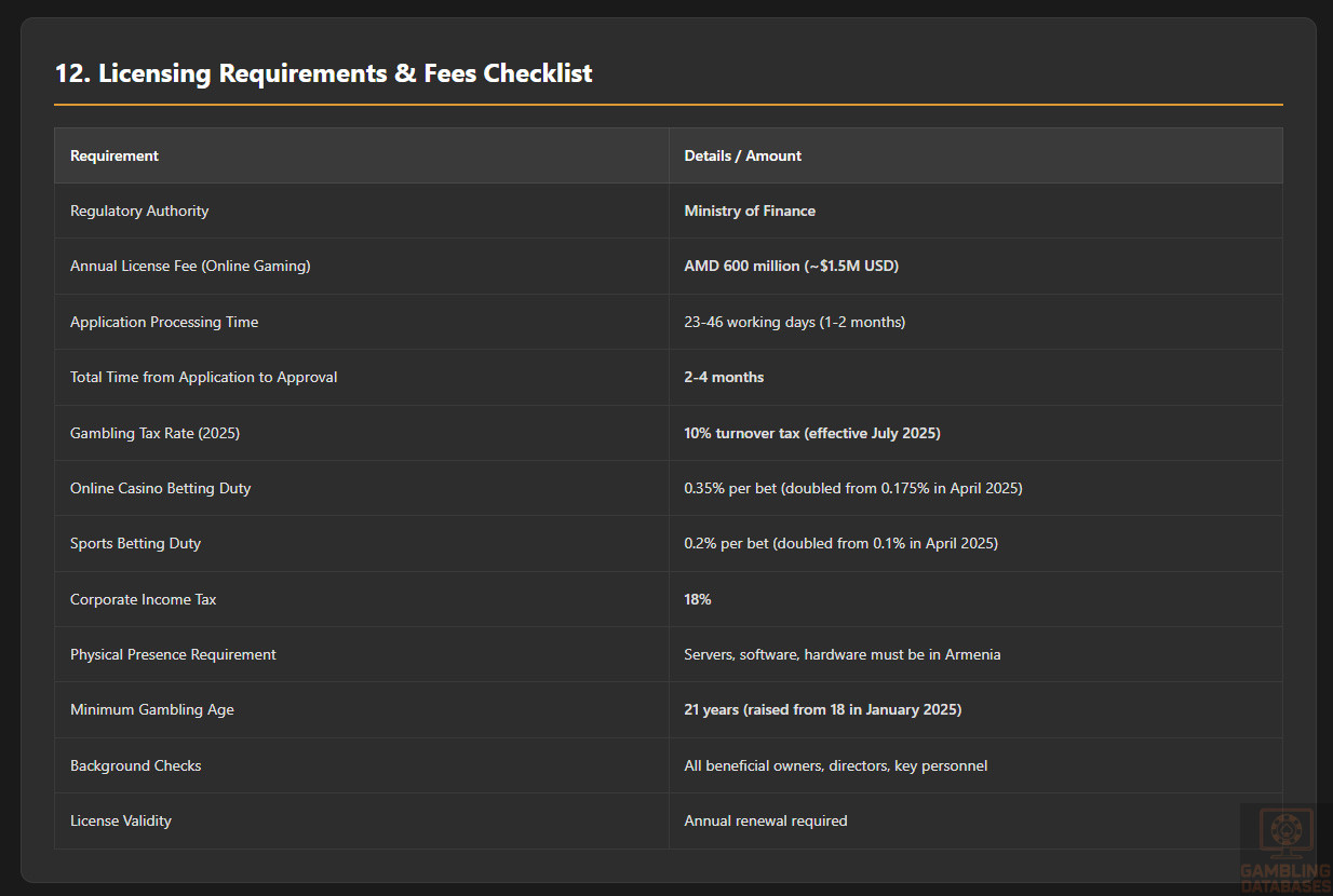 | Online Gambling/Casino | AMD 600 million (~$1.5M USD) | 23-46 working days | Local servers, Armenian entity |