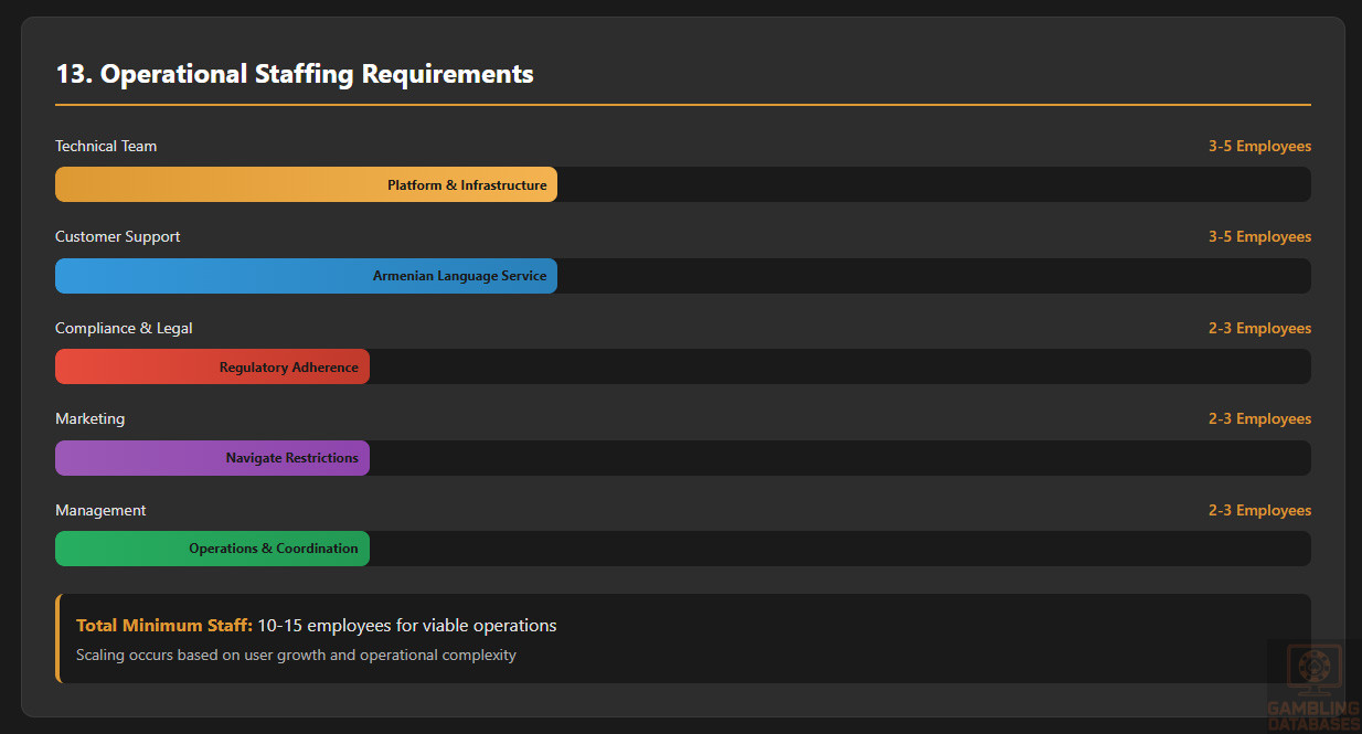 - [Operational Complexity:] MANDATORY physical infrastructure in Armenia – servers, software, hardware must be located domestically (this is rare and extreme requirement). Minimum 10-20 staff needed: technical team (3-5), customer support (3-5), compliance (2-3), marketing (2-3), management (2-3). Office space mandatory. Armenian language support essential. Total setup time 5-16 months depending on platform approach. Monthly costs $86K-318K excluding $1.5M license.