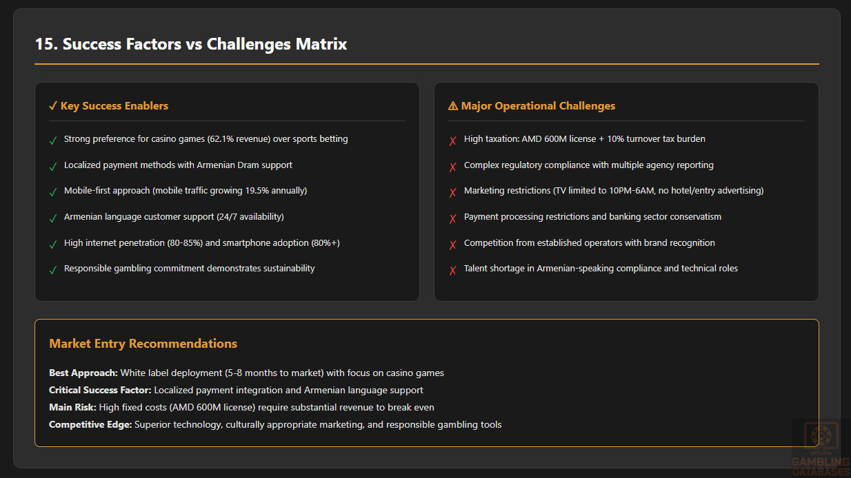⚠️ BOTTOM LINE: Armenia is suitable ONLY for the largest, most well-capitalized international operators willing to accept 5-10 year losses while building a presence in a strategically interesting but financially punishing market. For 95%+ of iGaming companies, Armenia represents a capital destruction opportunity that should be avoided entirely. The mathematics of $1.5M annual license + 10% turnover tax + 0.35% duties + 18% corporate tax in a $205M market simply don’t work. DO NOT ENTER unless you have deep pockets, high risk tolerance, and strategic reasons beyond pure profit.