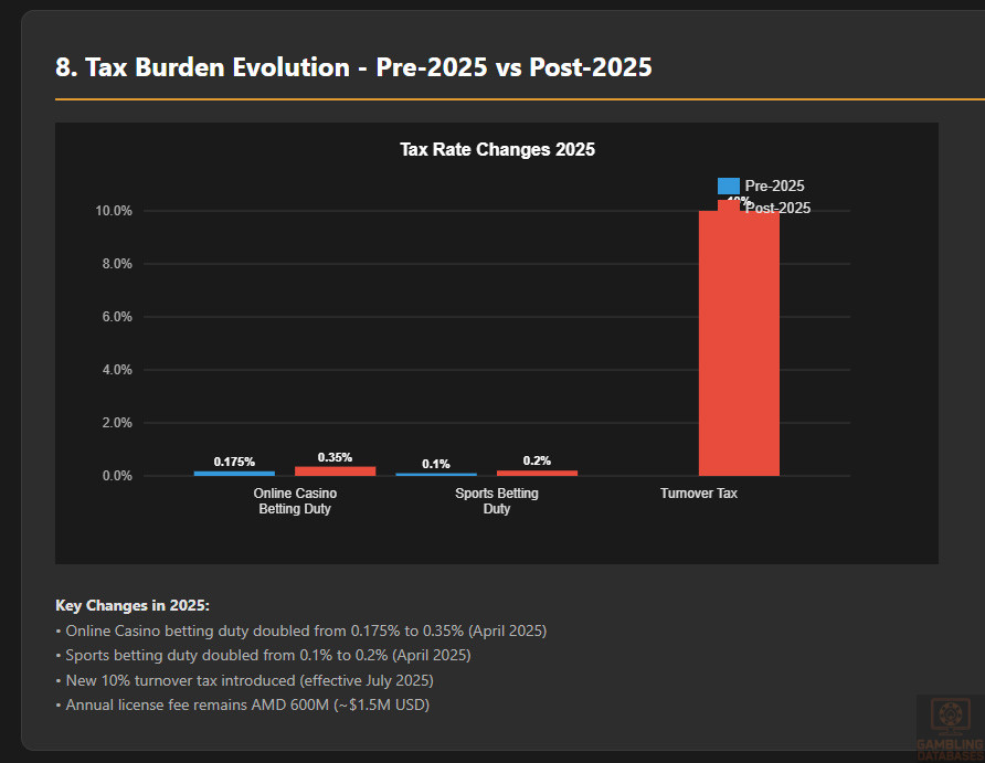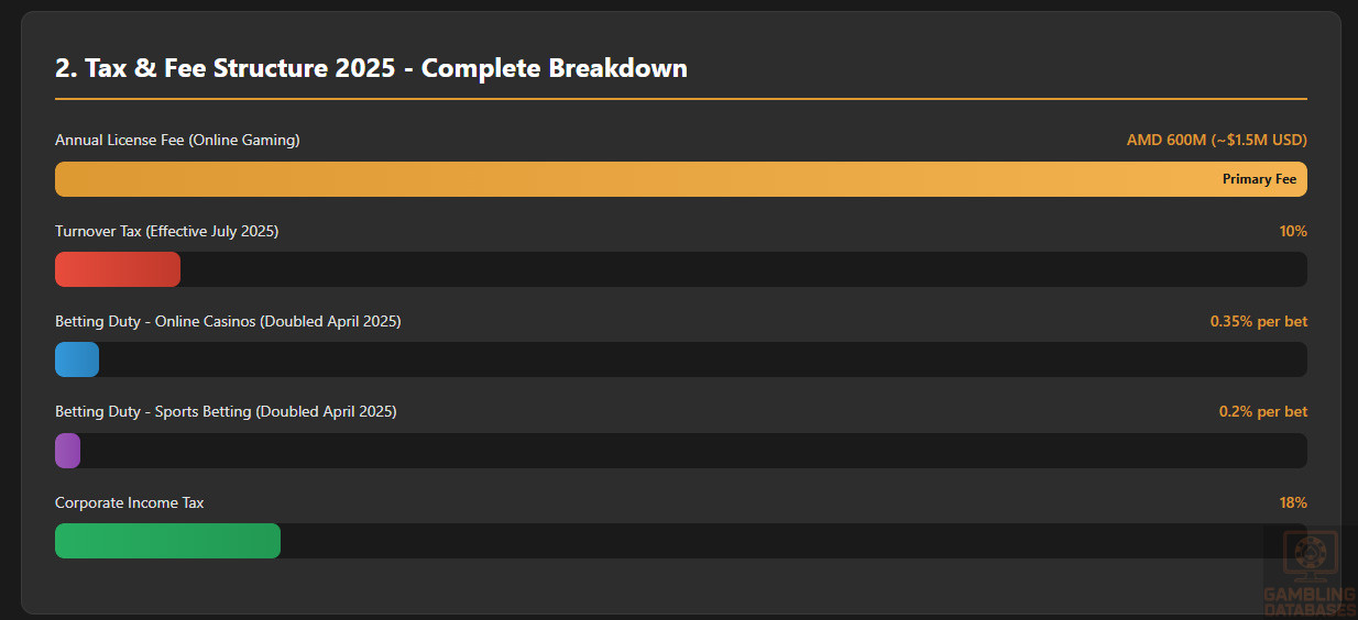 Fixed operational taxes include the annual licensing fee of AMD 600 million for online gambling operations, representing substantial upfront capital requirements. This fee applies regardless of operational revenue, creating significant fixed cost pressure particularly for new market entrants.