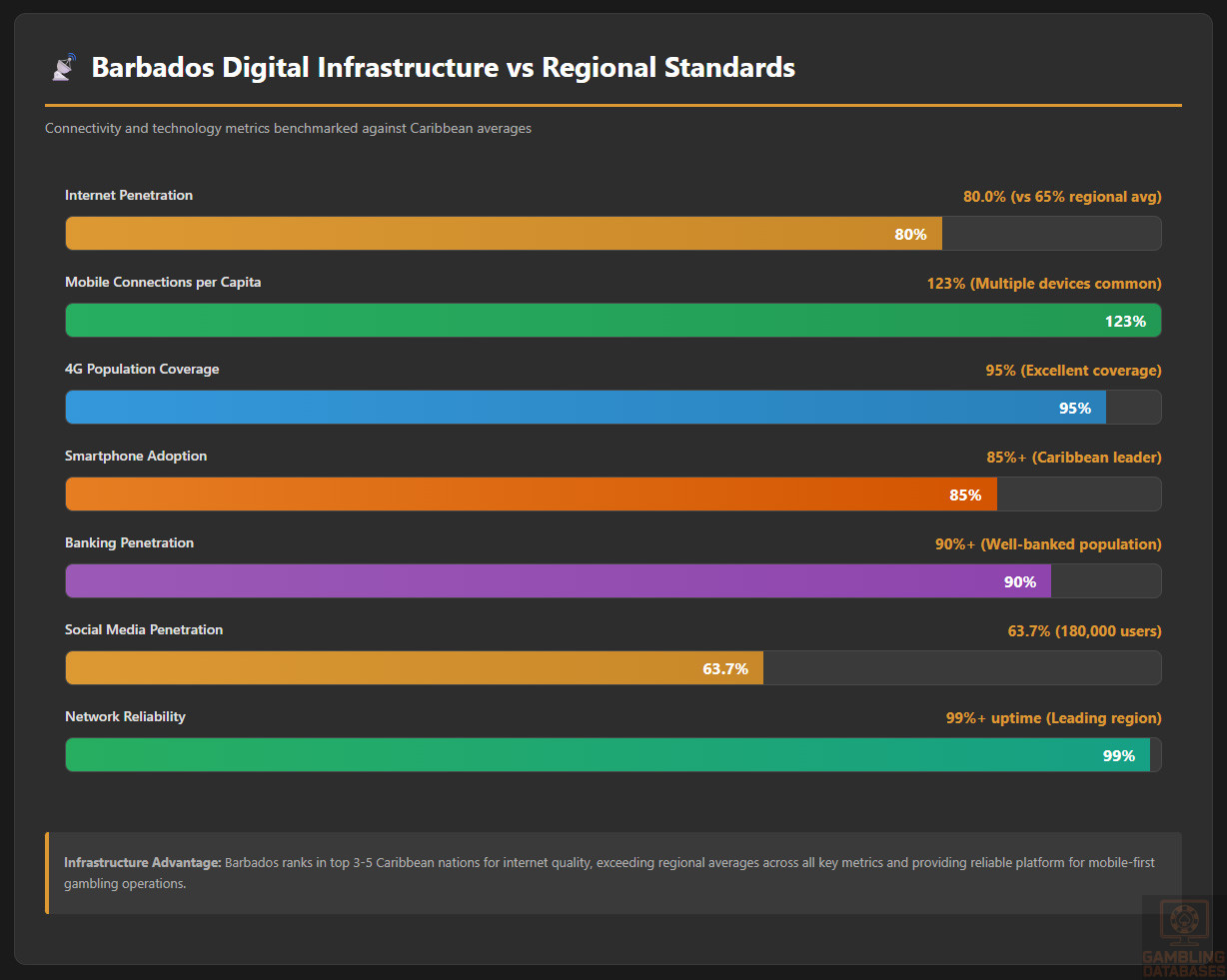 Current Market Structure: International operators serve Barbadian players from offshore jurisdictions without local licensing. These operators leverage established payment processing networks, international banking relationships, and marketing channels to reach Barbadian consumers. Market leaders include major European and Curacao-licensed brands with Caribbean market presence.
