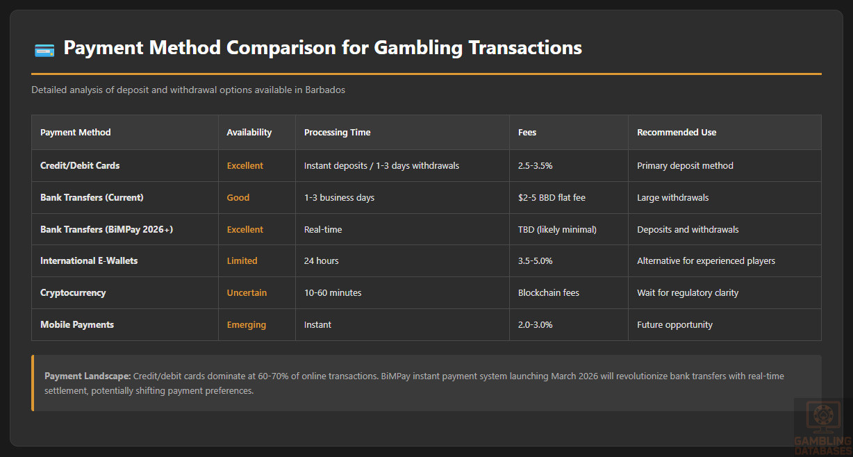 - [Payment Infrastructure Gaps]: BiMPay instant payment system doesn’t launch until March 2026 – 3+ years AFTER regulatory announcement. Until then, operators face 1-3 day bank transfer settlements. International e-wallets (PayPal, Skrill, Neteller) provide LIMITED Barbados support. Cryptocurrency regulatory uncertainty prevents integration. These payment limitations reduce player conversion by estimated 15-25%.