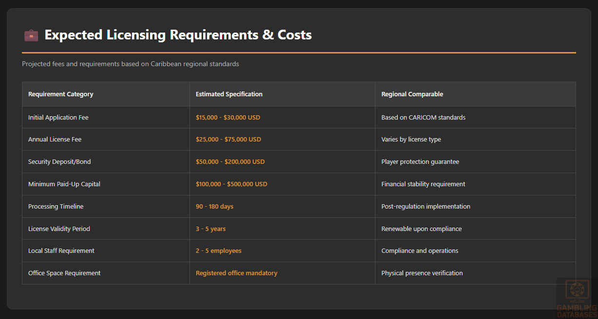 Expected Financial Requirements: While specific figures await regulatory framework publication, comparable Caribbean jurisdictions require initial license fees ranging from $15,000 to $50,000 USD annually, with security deposits between $50,000 and $200,000 USD. Minimum paid-up capital requirements typically range from $100,000 to $500,000 USD depending on license scope.