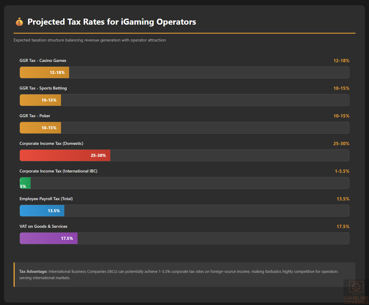 Corporate Income Tax: Barbados offers attractive corporate tax rates for international business companies ranging from 1-5.5% on foreign-sourced income. Gaming operations serving international markets may qualify for these preferential rates, while domestic operations face standard 25-30% corporate tax rates.