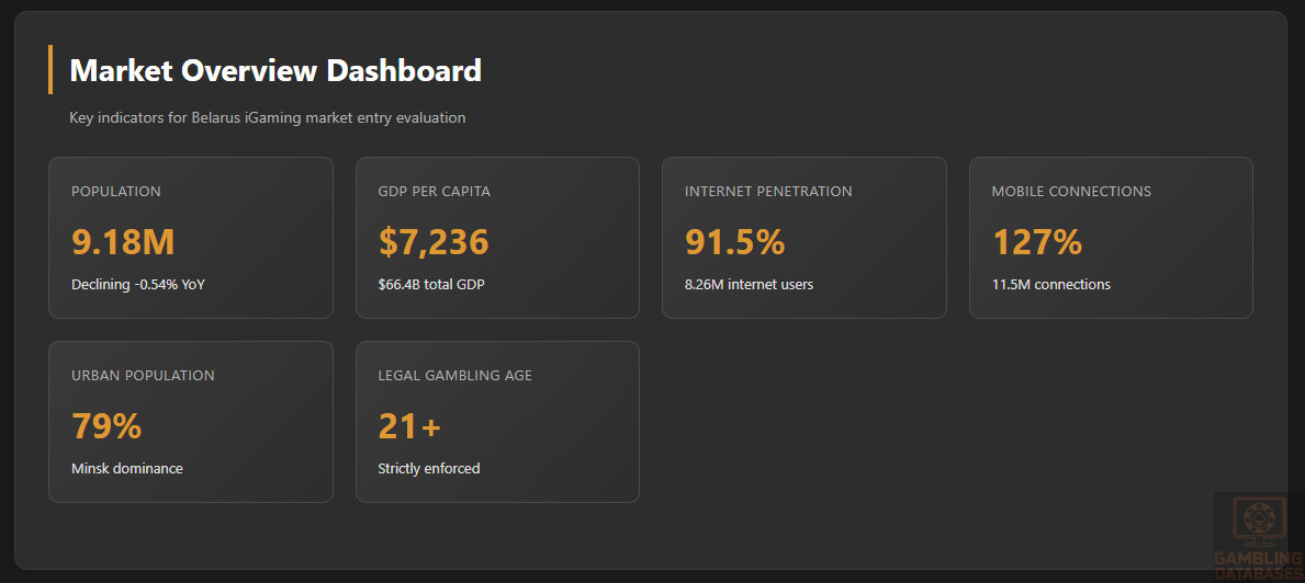 While online casino and sports betting are fully legal with a clear licensing framework, the combination of PROHIBITIVE capital requirements (€985,500 locked reserve for casino), extreme political risk under Lukashenko’s authoritarian regime, international sanctions complications, mandatory local server infrastructure, and a tiny declining market (9.18M population, -0.54% YoY) creates a difficult entry proposition.