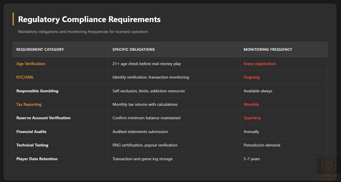 Data Retention: Player records, transaction histories, and game logs must be retained for specified periods to facilitate regulatory oversight and player dispute resolution. Retention periods typically span 5-7 years for financial records.