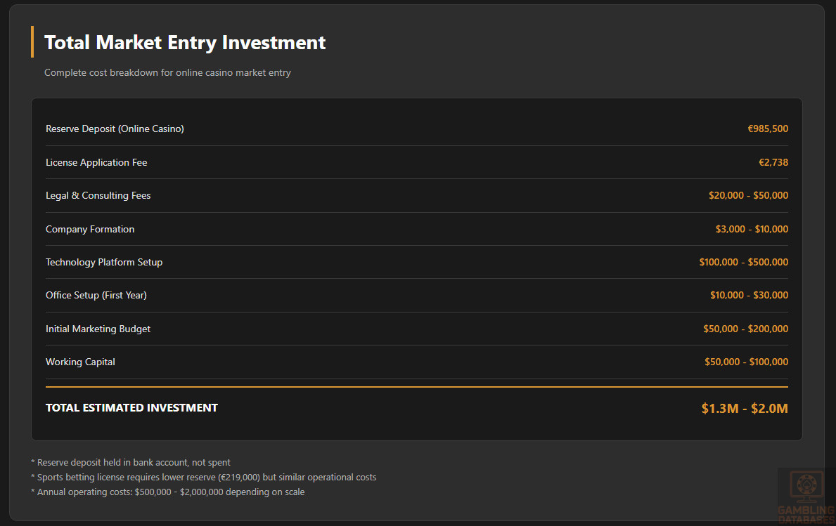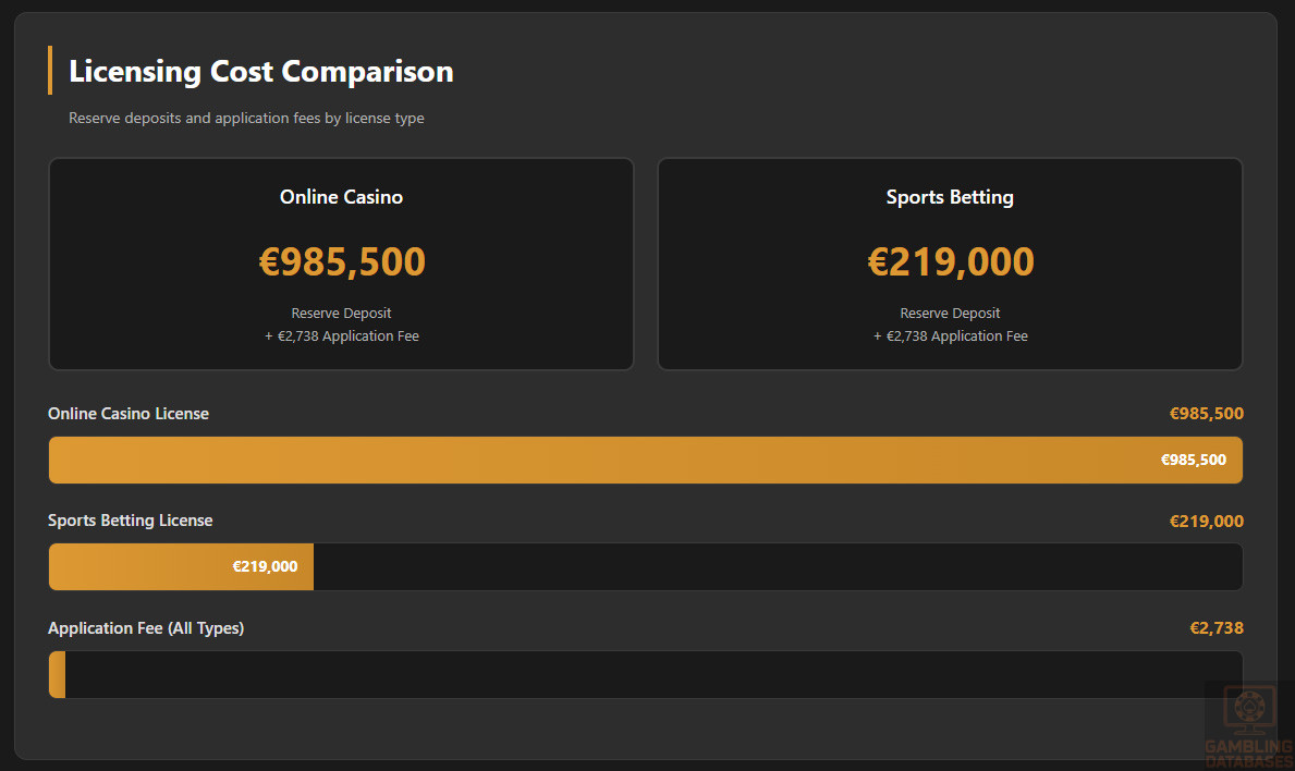 | Online Casino License Cost | €985,500 | Reserve deposit requirement |