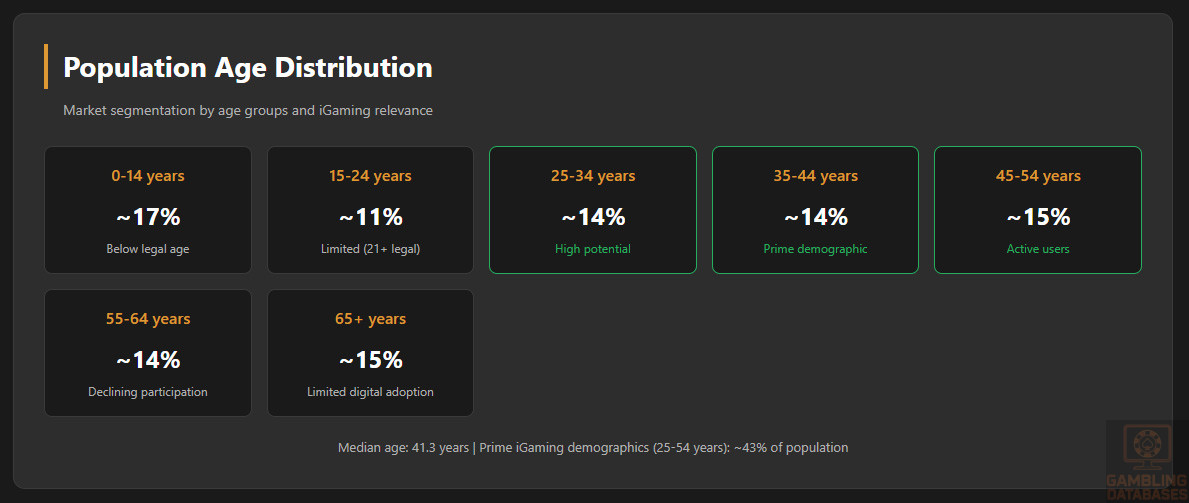 | Median Age | 41.3 years | Aging population demographic |