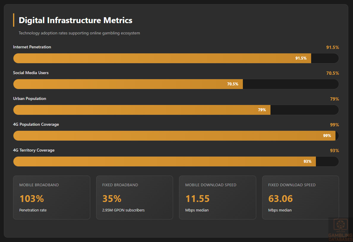 - Excellent digital infrastructure (91.5% internet, 127% mobile) enables efficient operations