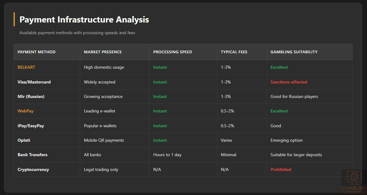 | Local Payment Integration | BELKART, ERIP, WebPay, iPay, EasyPay, Mir cards | International cards restricted by sanctions. Must offer local payment methods players trust. Payment friction = lost conversions. |