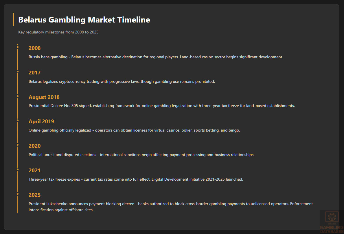 | Offshore/Unlicensed Operators | 🔴 High | ❌ ISP-level blocking actively implemented ❌ 2025 decree: banks authorized to block cross-border payments ❌ Criminal penalties for unlicensed operations ❌ Operators face potential imprisonment ❌ Intensifying enforcement environment ⚠️ Limited extradition risk (Belarus not extraditing to West currently) |