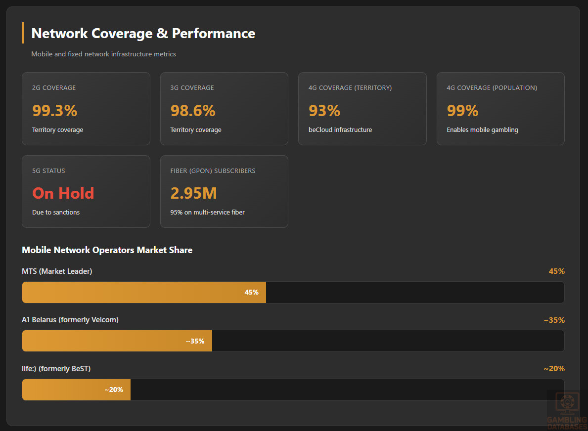Market Leaders: State-affiliated lottery operator RUP Belorusskiye Loterei operates the Belbet platform, which functions as an online lottery but offers casino-style games. International bookmakers including MaxLine and Marathon maintain market presence. The 888 poker room serves Belarusian players through licensed arrangements.