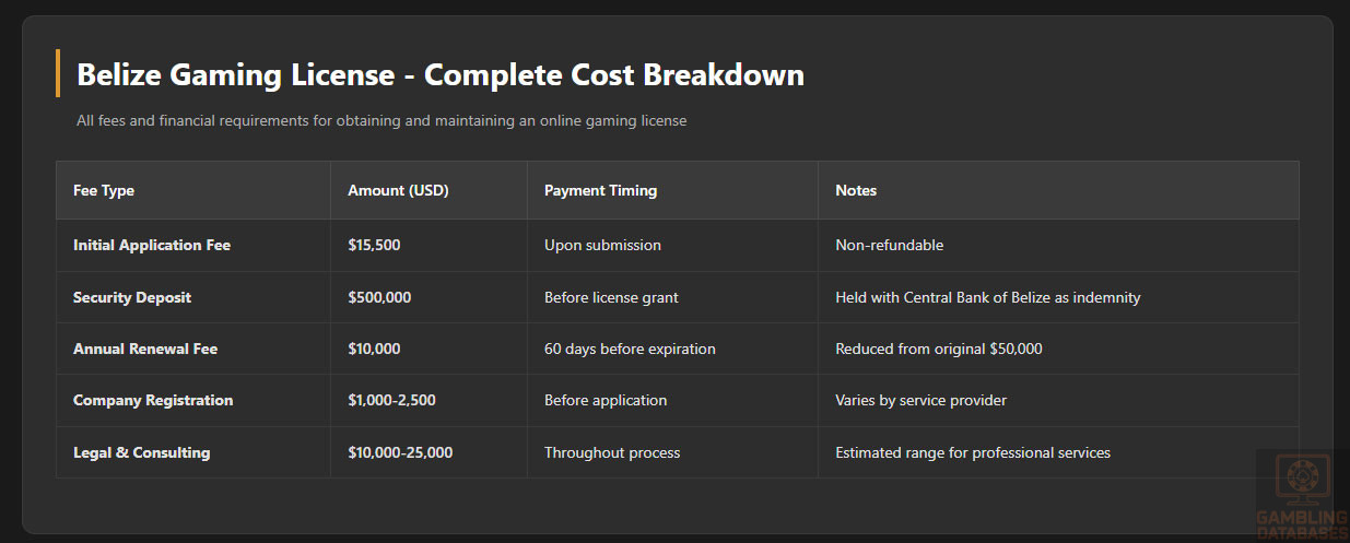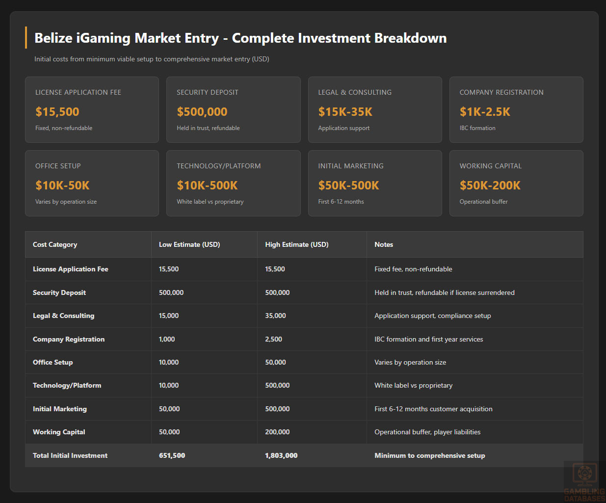 BOTTOM LINE: Belize competes with Curaçao, Panama, Costa Rica, and other offshore jurisdictions. Unless you specifically need Belize licensing for particular target markets, the USD 500,000 deposit requirement makes it economically inferior to alternatives. Only suitable for well-capitalized operators (USD 1M+ available capital) with proven international player acquisition capabilities and 3-5 year horizons.