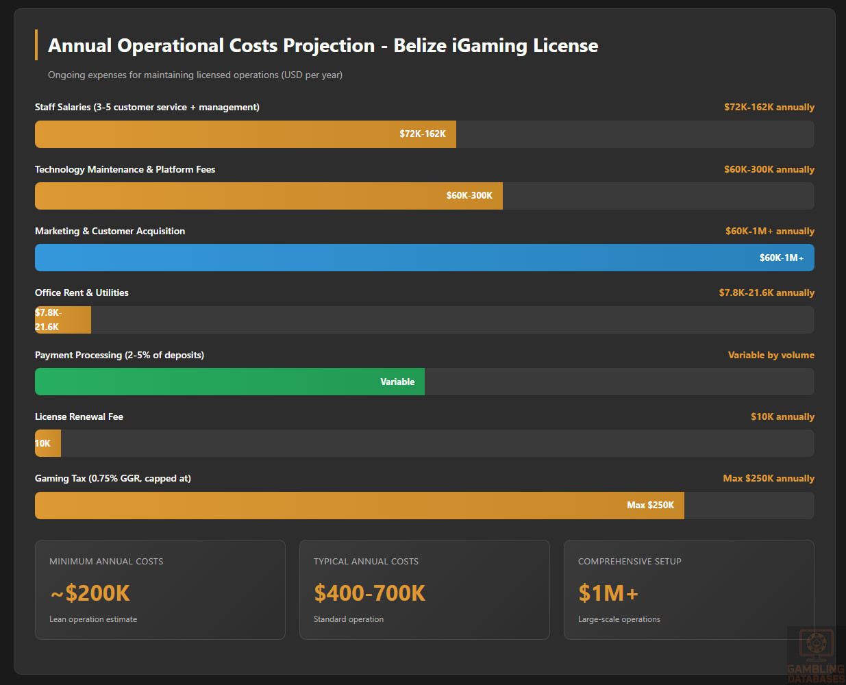 Profitability Assessment: Belize’s economics are ONLY viable for operators who can successfully acquire and retain players in competitive international markets. The USD 500,000 security deposit creates enormous opportunity cost (USD 25,000-50,000/year) that must be recovered through operations. Monthly costs of USD 10,000-30,000+ require significant revenue just to break even.