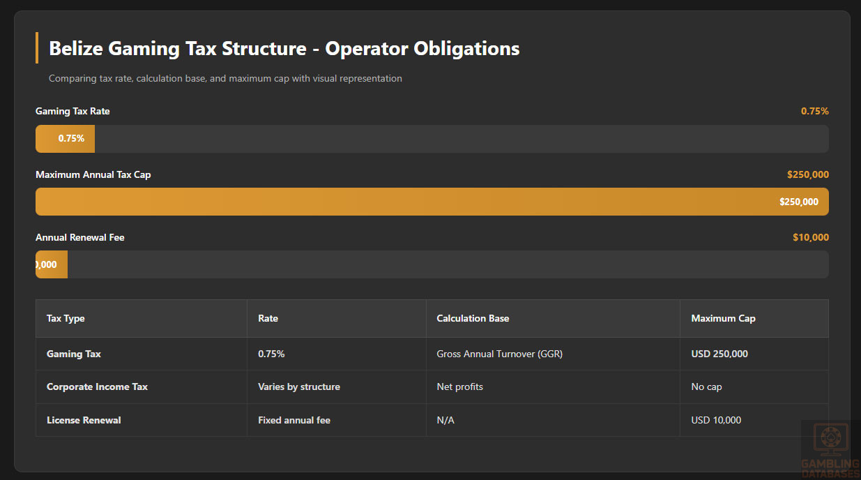 Operator taxation in Belize represents one of the jurisdiction’s primary competitive advantages. The tax rate stands at just 0.75% of gross annual turnover with an absolute maximum cap of USD 250,000 per year. This structure makes Belize one of the most tax-advantaged gaming jurisdictions globally.