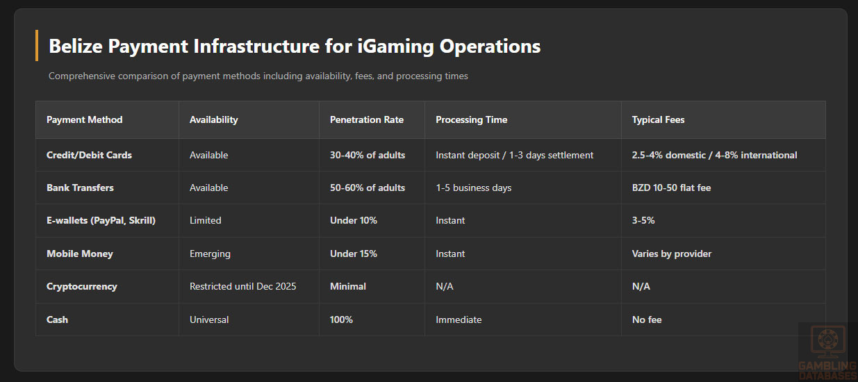 - Lacking established payment processing relationships (Belize infrastructure insufficient, must use international processors at 4-8% fees)