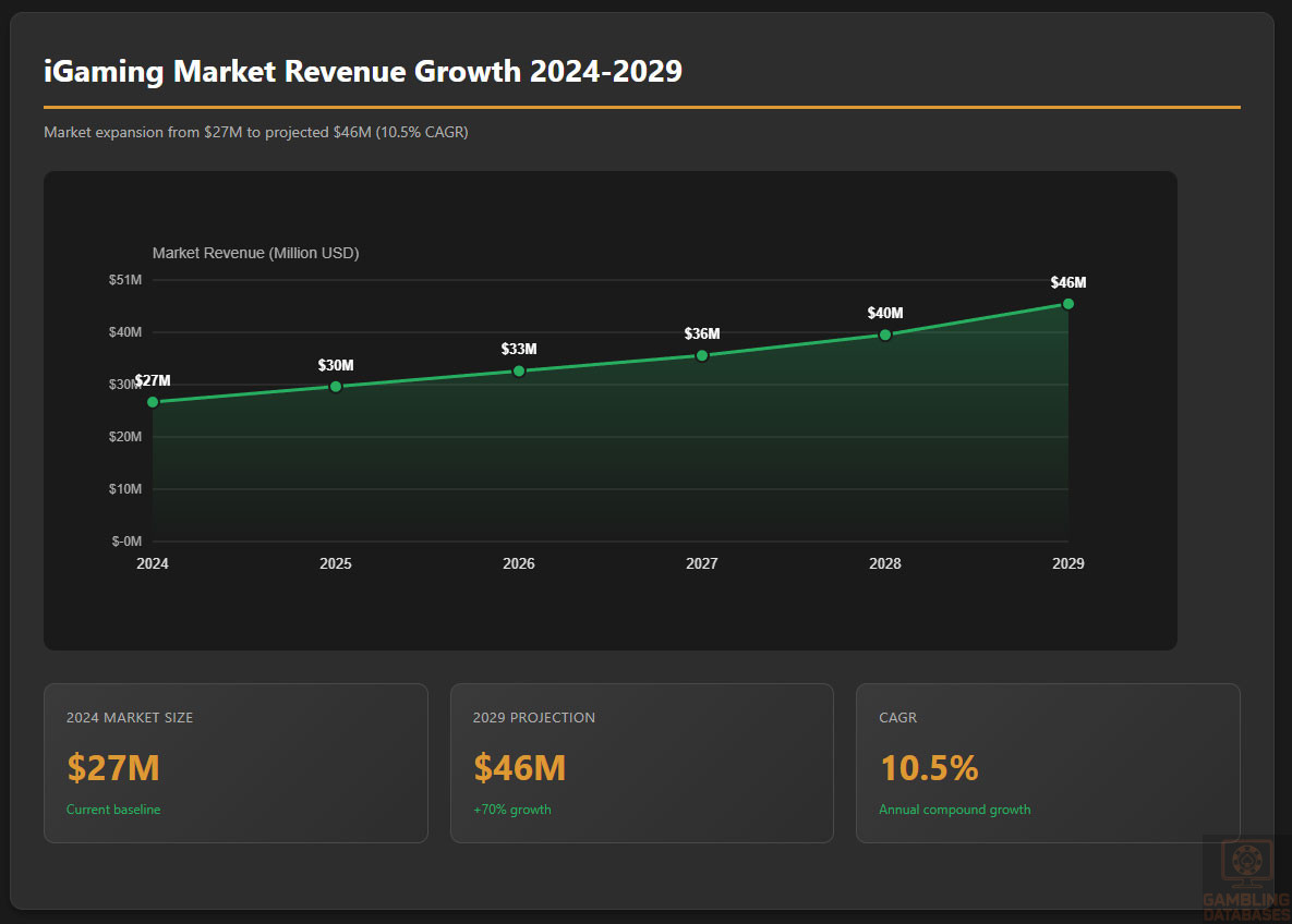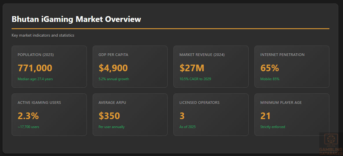 - EXTREME MARKET SIZE LIMITATION: $27 million total market revenue (2024) makes this one of world’s smallest licensed iGaming markets. For comparison, Malta processes more revenue in hours than Bhutan generates annually. Only 17,700 active users total. Economics simply don’t work for most operators – market too small to justify $450,000+ entry costs and $1M capital requirement.