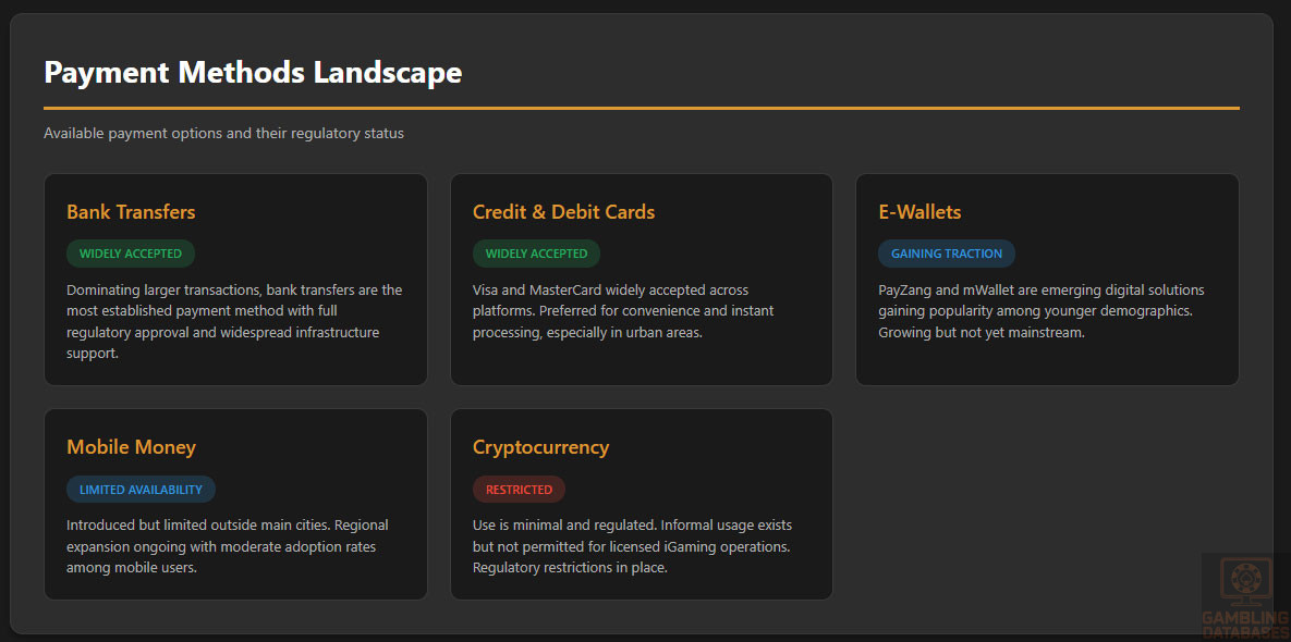 - PAYMENT METHOD LIMITATIONS: Banking system penetration moderate, especially rural areas. E-wallets emerging but not widespread. Cash culture persists. Digital payment infrastructure years behind developed markets. Creates friction in deposits/withdrawals.