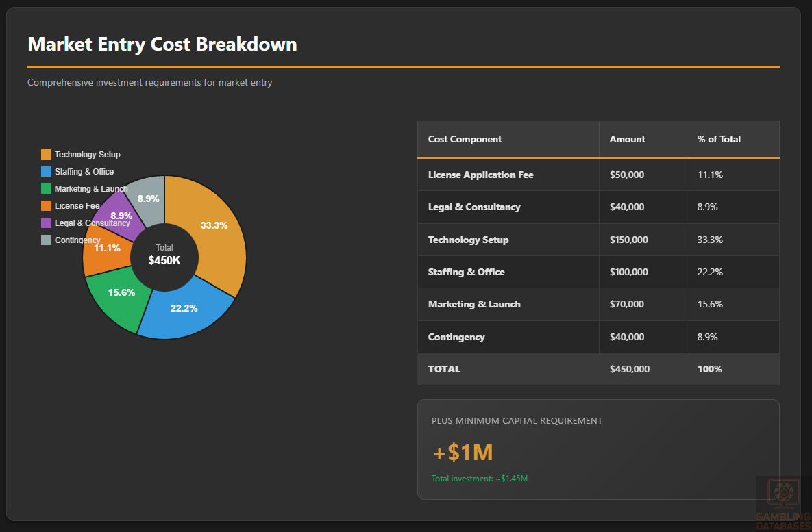 CRITICAL ISSUE: Only 3 licenses exist as of 2025, making market entry impossible for new operators regardless of capital or capability. Even if license became available through acquisition, the $1M capital requirement held in escrow (generating minimal returns) represents massive opportunity cost. For comparison: same $1.37M investment in established markets like UK, Malta, or Ontario would generate 5-10x higher returns with lower regulatory complexity.