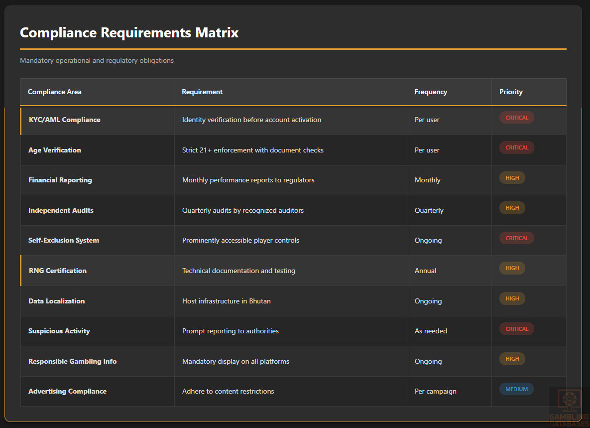 Safe Jurisdictions: Not applicable for licensed operators. Unlicensed operators should note that Bhutan’s Buddhist cultural values and stable governance create predictable legal environment – authorities likely to enforce prohibitions consistently rather than sporadically. Geographic isolation and small market size may limit practical international enforcement capability, but operators should not assume immunity.