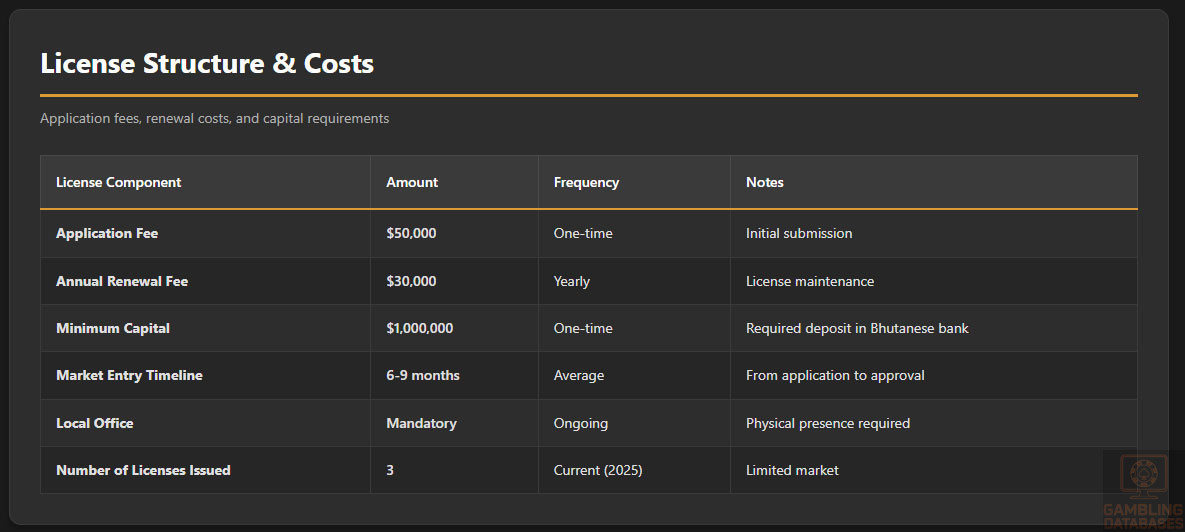 - PROHIBITIVE CAPITAL REQUIREMENTS: $1 million minimum capital held in Bhutanese bank is absurdly high for $27M market (3.7% of entire market must be held as capital). Additionally requires $50,000 license fee, $150,000 technology setup, $100,000 office/staffing, $70,000 marketing. Total $1.37M+ to enter $27M market with 10.5% growth = terrible ROI economics.