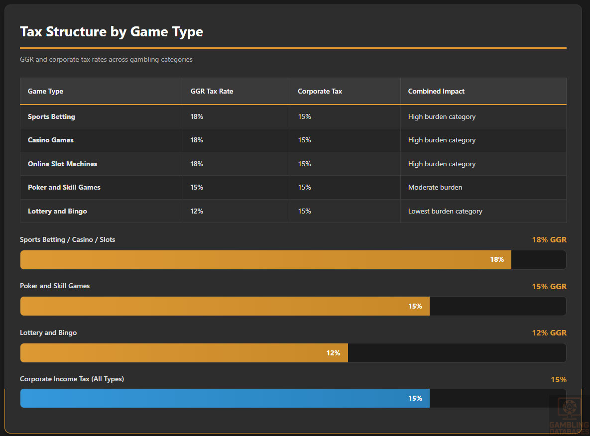Operators pay an 18% gross gaming revenue (GGR) tax alongside a corporate income tax rate of 15%. Additionally, fixed operational license fees and turnover-based levies are part of the financial obligations.