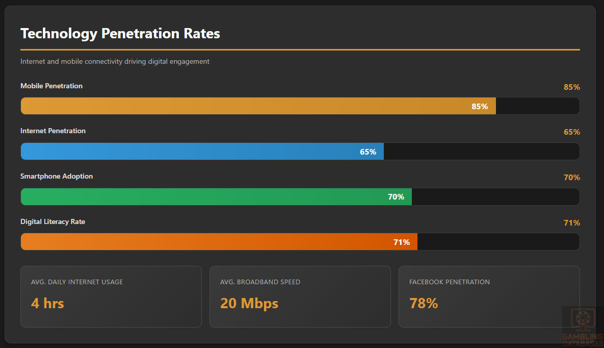 - INFRASTRUCTURE GAPS: Only 65% internet penetration leaves 270,000 people (35% of population) without access. Rural areas particularly underserved. Average 20 Mbps speeds barely adequate for modern gaming experiences. 5G still in pilot phase, years away from widespread deployment.