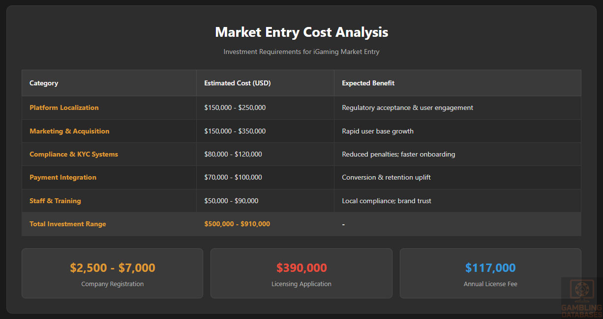 - COST BREAKDOWN: Total first-year setup costs range USD 500,000-800,000 EXCLUDING the USD 6 million license fee – realistic minimum investment is USD 7-8 million