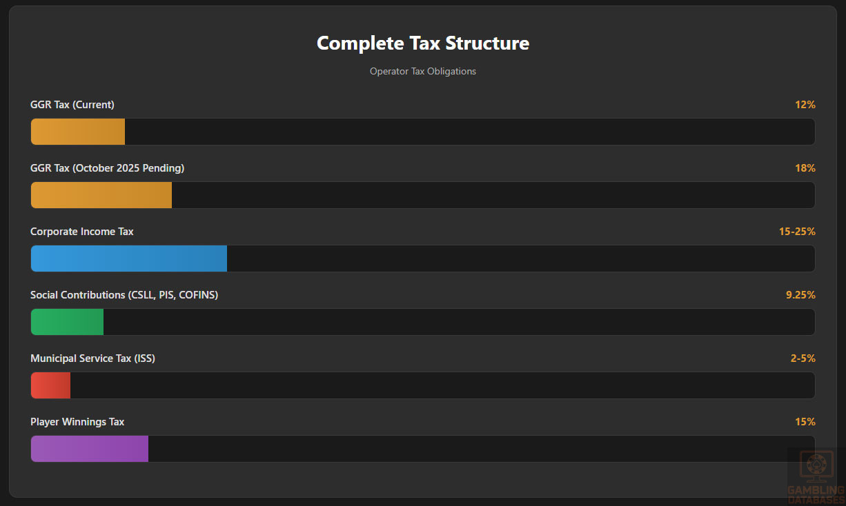 Effective Tax Rate on Revenue: 50-60% total (18% GGR + 15-25% corporate income + 9.25% social contributions + 2-5% municipal service tax)