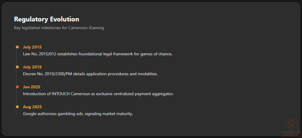 | Legal Gambling Framework Established | Law No. 2015/012 (July 2015) |