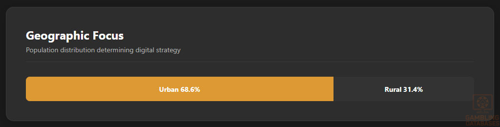 Urbanization is significant, with about 68.6% of the population living in urban centers and 31.4% in rural areas. This urban majority influences consumer behavior, including gambling participation and digital adoption.