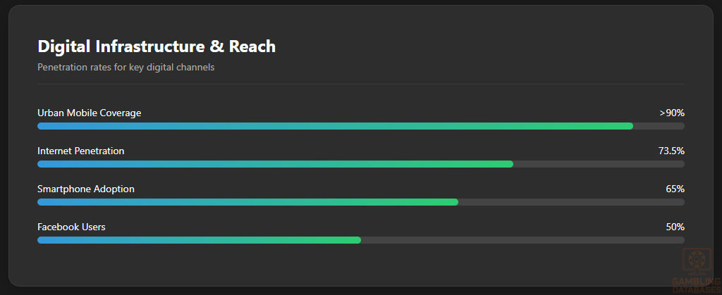 Internet penetration stands at approximately 73.5% of the population as of early 2025, with rural areas lagging urban centers. Mobile internet is predominant, with increasing smartphone adoption enabling access to digital gambling platforms.